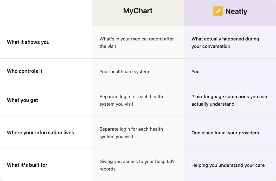 Here's the thing: MyChart isn't a competitor to Neatly. They're fundamentally different tools built for different purposes.